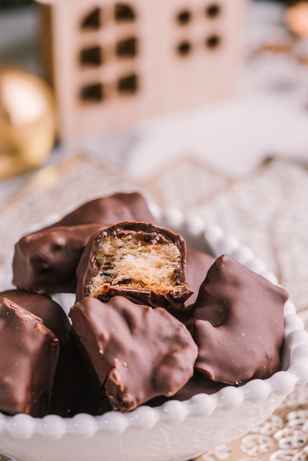 Caixinha presenteável com pedacinhos de chocottone banhados no chocolate;