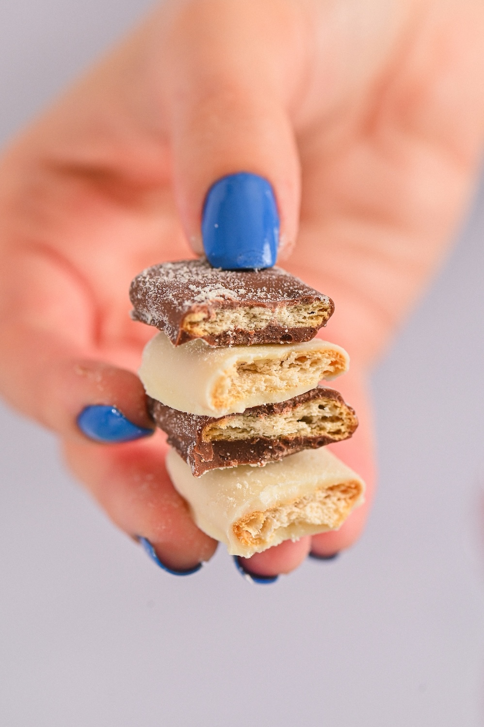Deliciosas bolachinhas em dois sabores: Chocolate branco e chocolate ao leite, envolvidas no leite em pó;