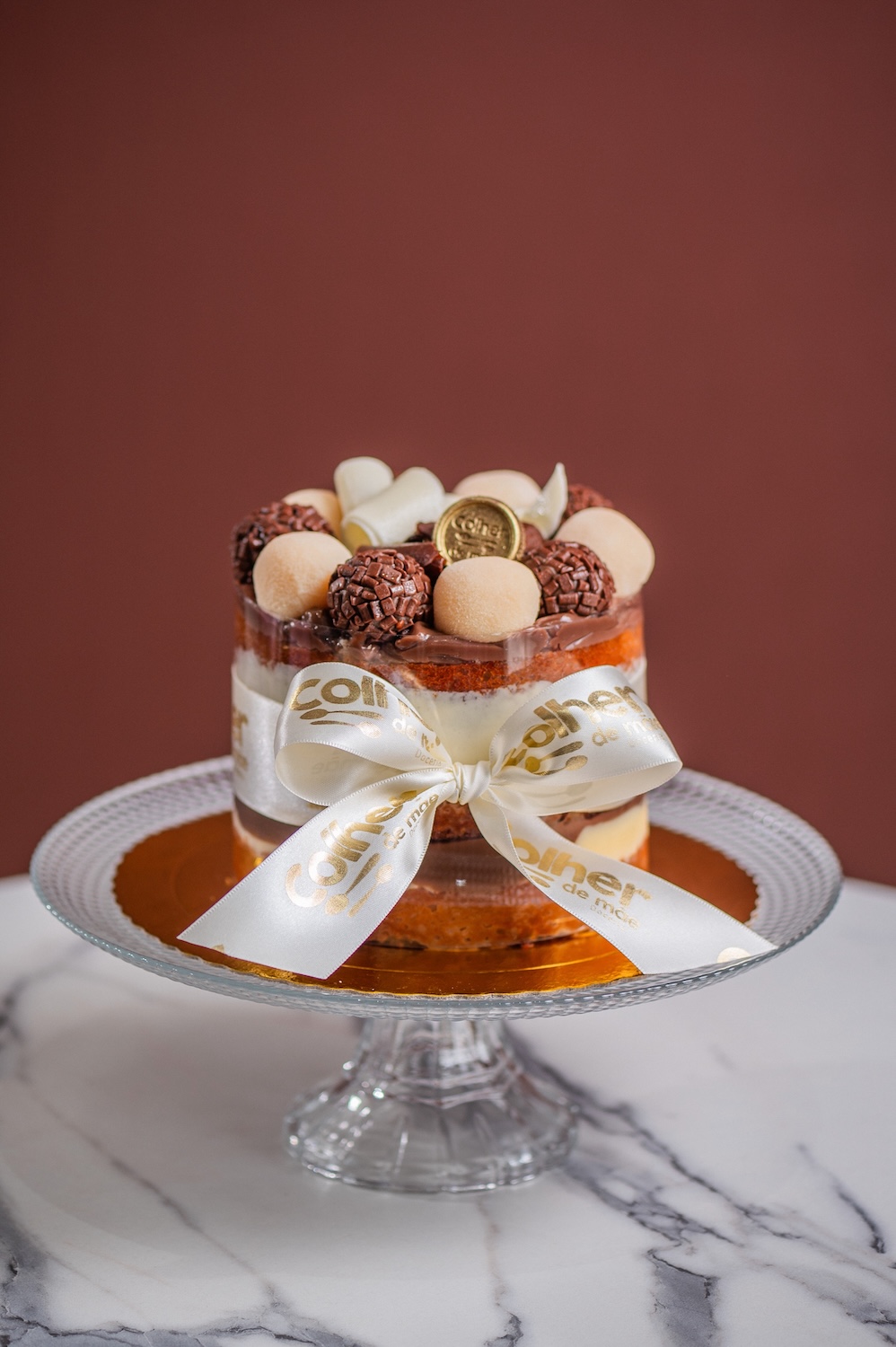 Bolo com massa de baunilha, mousse 4 leites, ninho e brigadeiro. Decorado com cobertura de brigadeiro, docinhos de ninho e de brigadeiro, raspas de chocolate branco e chocolate ao leite;
