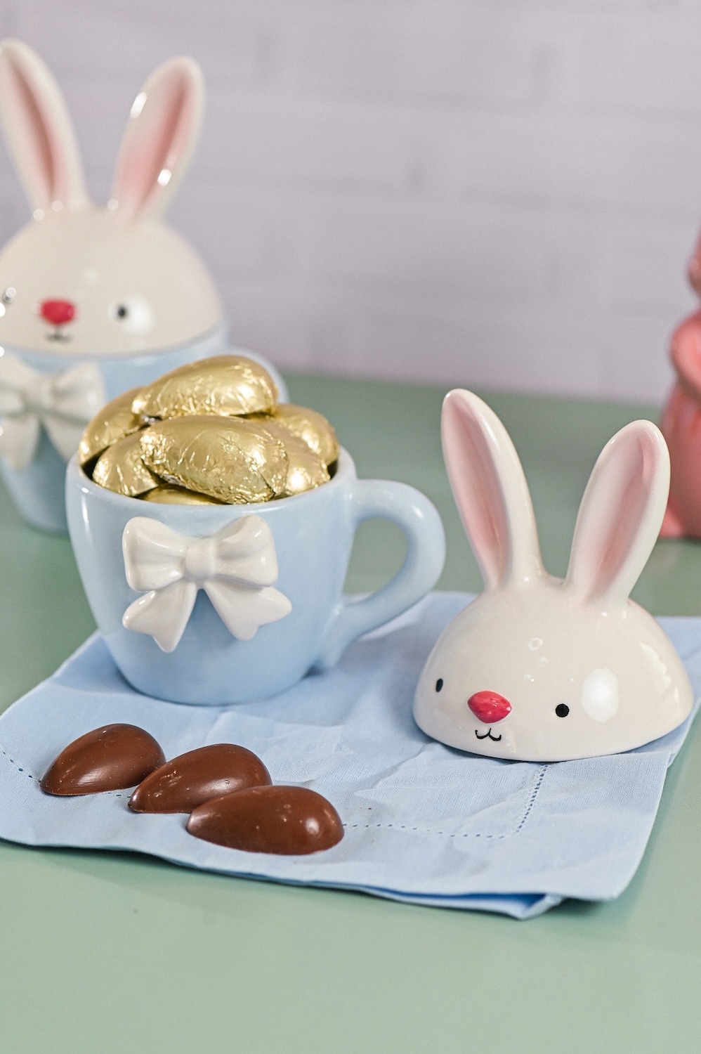 Caneca fofa de Páscoa com 12 ovinhos de chocolate nobre: ao leite e crocantes; peso aprox.: 120g