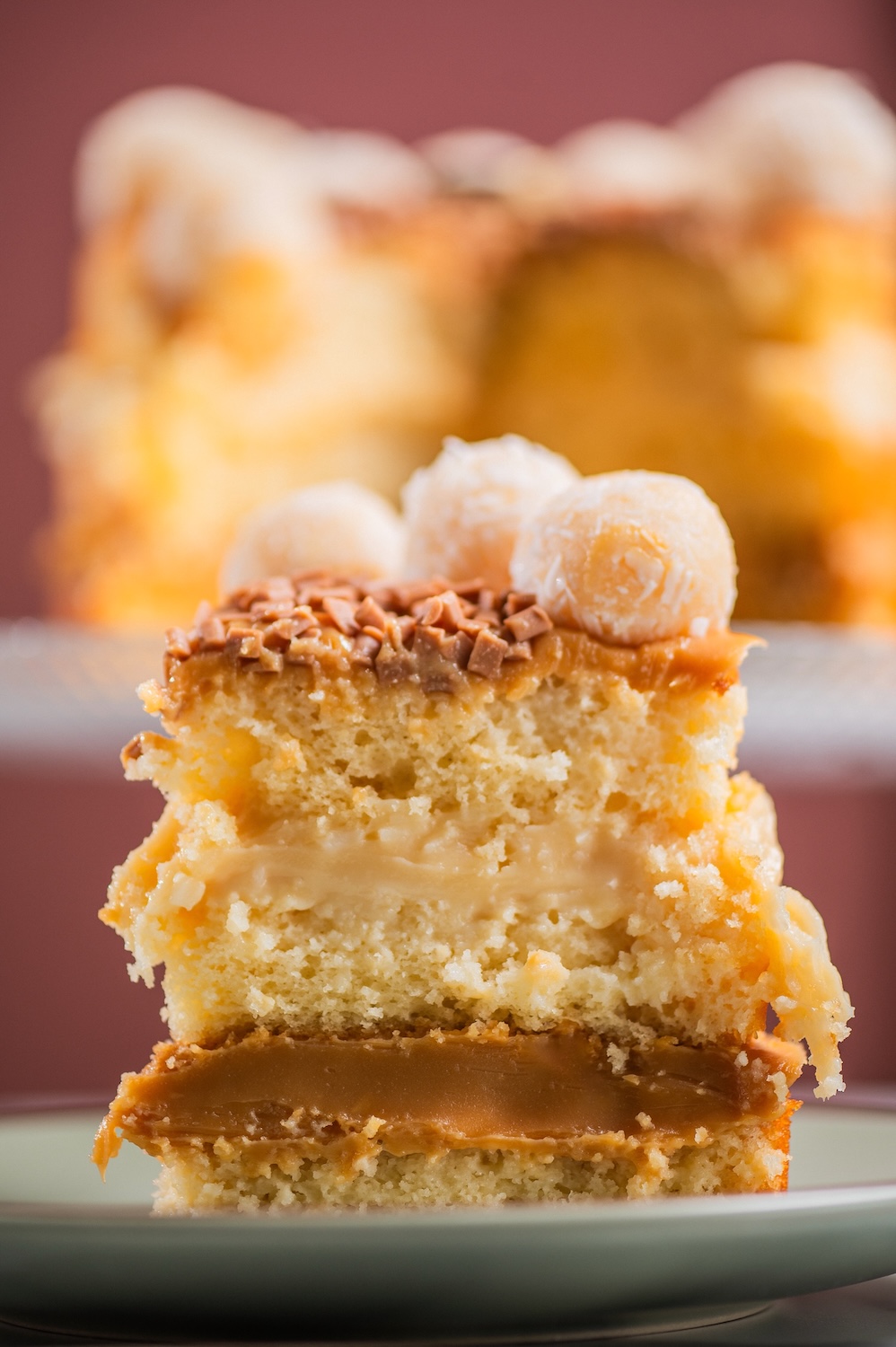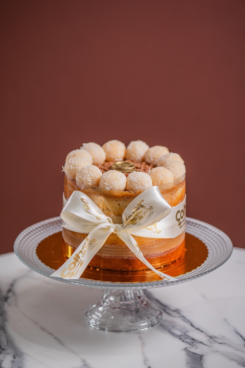 Bolo com massa de baunilha, coco cremoso e doce de leite artesanal. Decoração com cobertura de doce de leite, docinhos de coco e confeito de chocolate de caramelo;