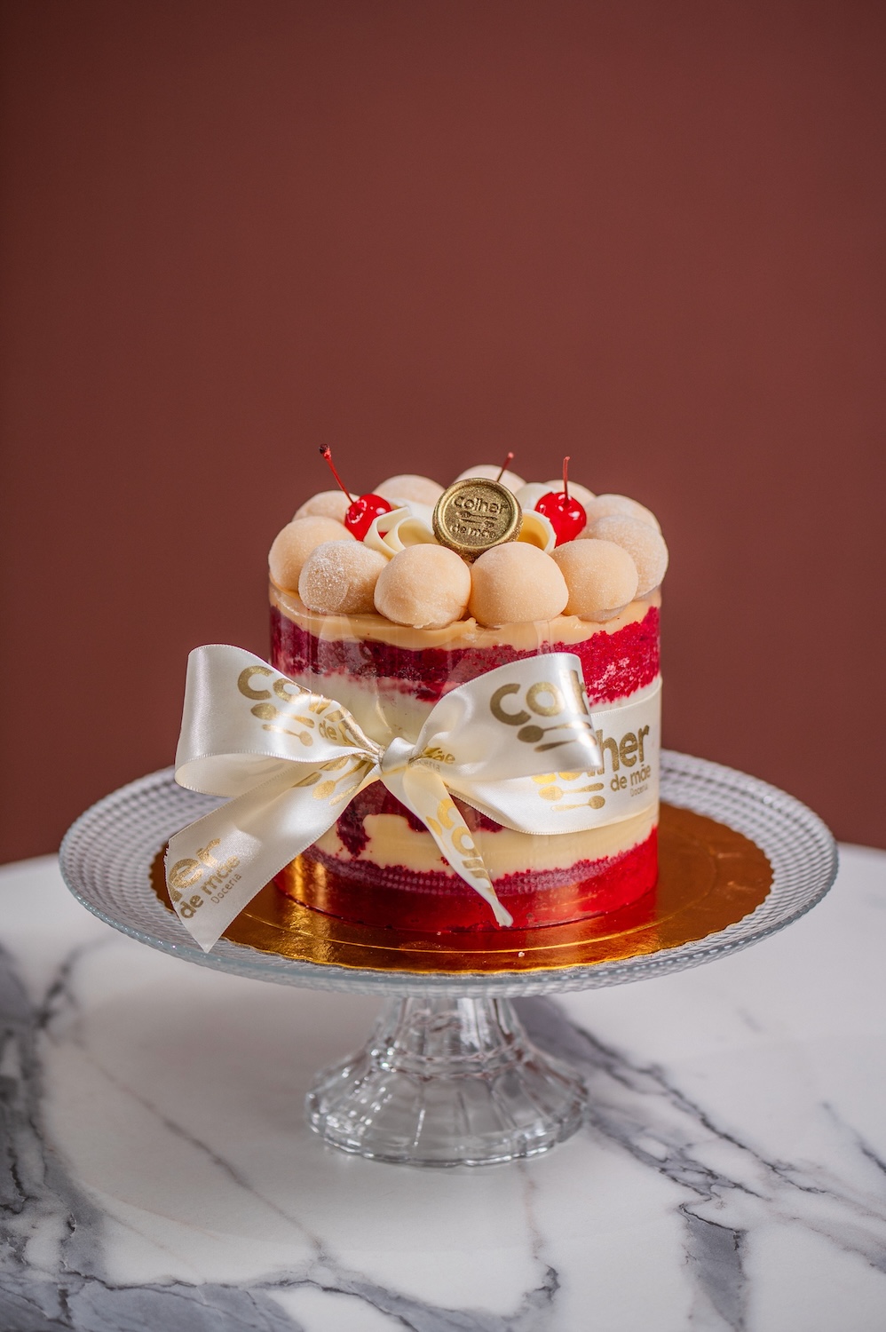 Bolo com massa red velvet, mousse 4 leites, ninho e geleia de frutas vermelhas. Decoração com cobertura de brigadeiro de ninho, docinhos de ninho, raspas de chocolate branco e cerejas;