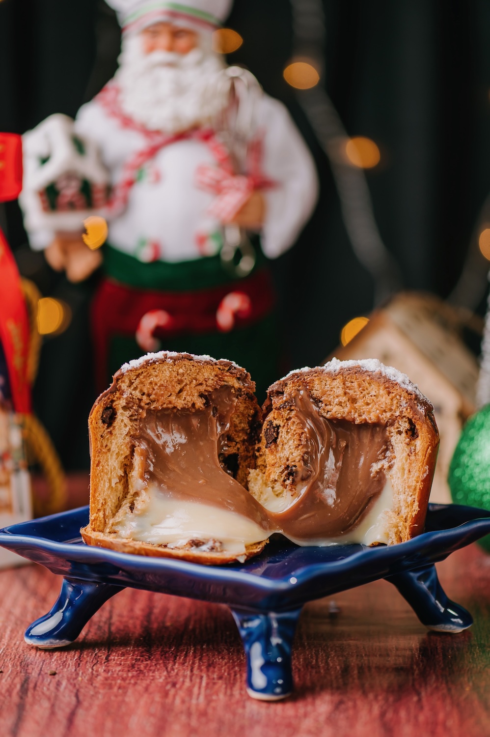 Mini chocottone, recheado com brigadeiro ao leite e brigadeiro de ninho;