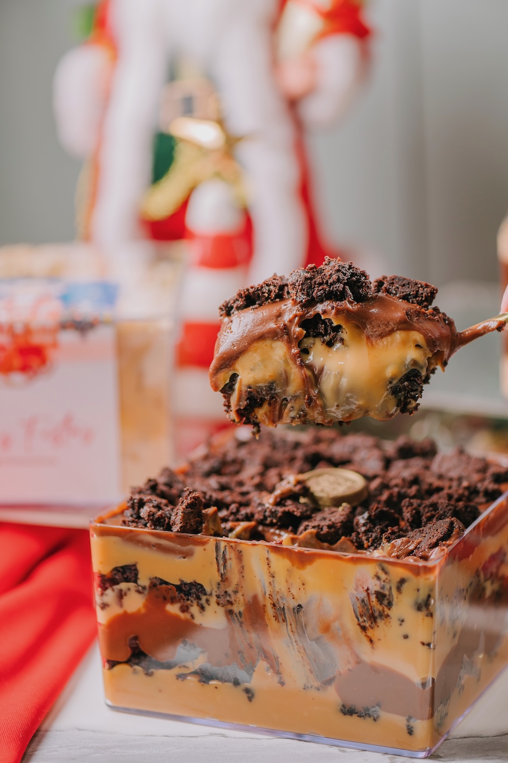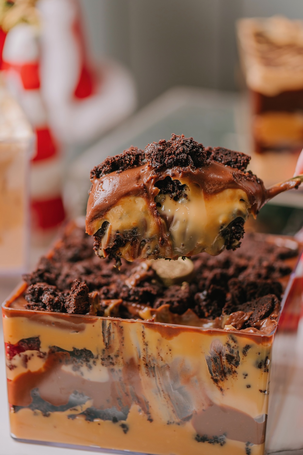 Uma linda sobremesa feita na caixa de acrilico! São camadas de doce de leite cremoso, brownie, chocolate meio amargo e caramelo salgado; Pesa aprox 1,2kg, serve 10 porções;