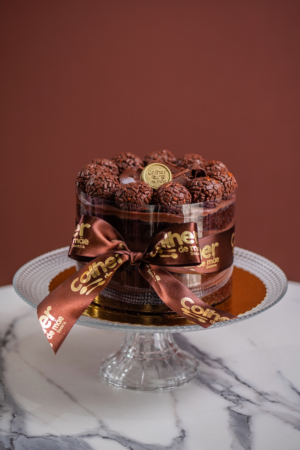 Bolo com massa de chocolate, mousse chocoblend e brigadeiro meio amargo. Decorado com cobertura de brigadeiro ao leite, docinhos de brigadeiro e raspas de chocolate;